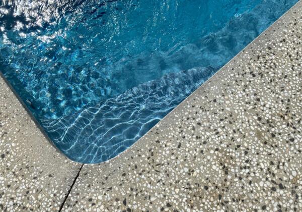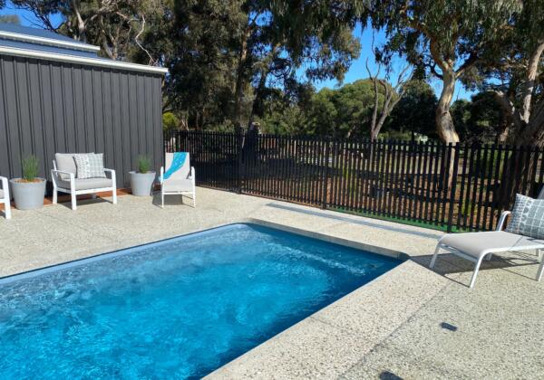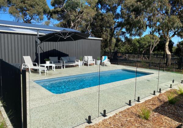 This 7m Darling fibreglass swimming pool in the colour misty blue crystal granite ticks all the boxes for its magnificent Ocean Grove coastal feel. This pool is used all year round with the Oasis 19kw electric heat pump allowing a comfortable swim in any type of Victorian weather, overcast or sunshine. The honed concrete is stunning to look at while being soft underfoot, non-slip and easy to keep clean.