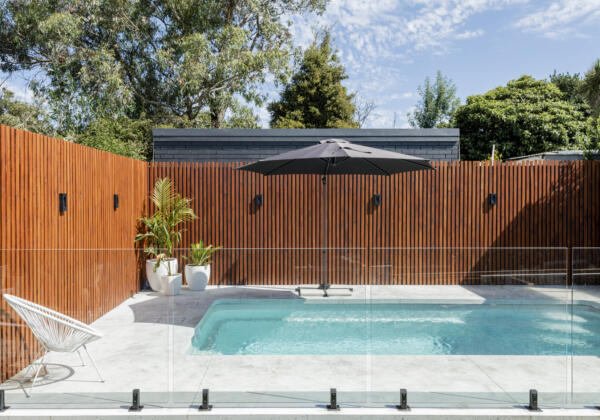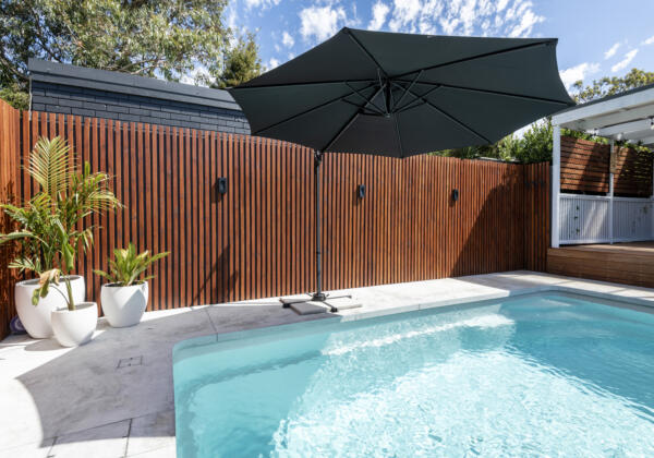 One of our favourite projects to date and the end results greatly exceeded our expectations. This pool is the 6m Darling fibreglass pool in the colour – pearl shell. The rounded edges on the honed concrete signify this pools uniqueness and style. The concrete was completed by Mcintosh Concrete Geelong, complete with a burnished finish that complements the pool colour perfectly.